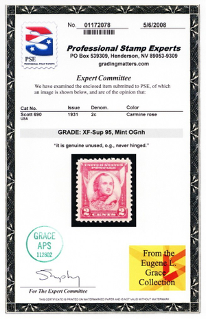 Due to the high cost of obtaining certificates we will only refund the cost of the stamp and not the cost of the certificate for stamps that sell for less than $250 that come back with a negative certificate. Stamps that sell for above $250 will receive a full refund for both the price of the stamp and cost of the certificate if it should come back not as described. For U.S. stamps only certificates from either APS, PSE or from the Philatelic Foundation are accepted, however "graded" certificates or "encased" items are not accepted.