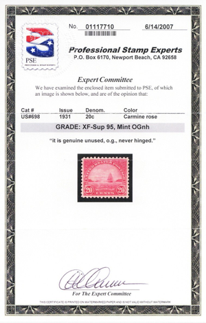 Due to the high cost of obtaining certificates we will only refund the cost of the stamp and not the cost of the certificate for stamps that sell for less than $250 that come back with a negative certificate. Stamps that sell for above $250 will receive a full refund for both the price of the stamp and cost of the certificate if it should come back not as described. For U.S. stamps only certificates from either APS, PSE or from the Philatelic Foundation are accepted, however "graded" certificates or "encased" items are not accepted.