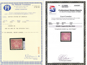 No refunds will be made after 60 days after the sale date unless extra time is granted. Due to the high cost of obtaining certificates we will only refund the cost of the stamp and not the cost of the certificate. For U.S. stamps only certificates from either APS, PSE or from the Philatelic Foundation are accepted, however "graded" certificates or "encased" items are not accepted.