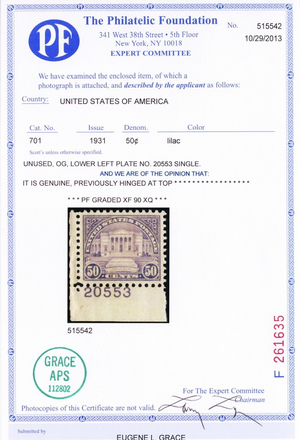 Due to the high cost of obtaining certificates we will only refund the cost of the stamp and not the cost of the certificate for stamps that sell for less than $250 that come back with a negative certificate. Stamps that sell for above $250 will receive a full refund for both the price of the stamp and cost of the certificate if it should come back not as described. For U.S. stamps only certificates from either APS, PSE or from the Philatelic Foundation are accepted, however "graded" certificates or "encased" items are not accepted.
