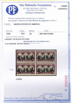 Due to the high cost of obtaining certificates we will only refund the cost of the stamp and not the cost of the certificate for stamps that sell for less than $250 that come back with a negative certificate. Stamps that sell for above $250 will receive a full refund for both the price of the stamp and cost of the certificate if it should come back not as described. For U.S. stamps only certificates from either APS, PSE or from the Philatelic Foundation are accepted, however "graded" certificates or "encased" items are not accepted.