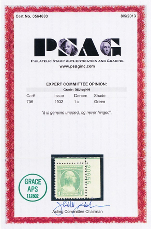 705, Mint NH 1¢ XF/Superb JUMBO - PSAG Graded 95J * Stuart Katz