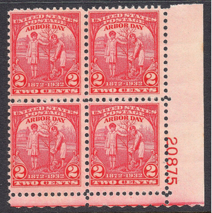 | #717 F-VF MNH OG 2c ARBOR DAY LR POSITION PLATE BLOCK of FOUR!! F-VF MNH OG LR PLATE BLOCK OF 4 of Scott #717 2 cent Arbor Day commemorative, rotary press printing version. Great centering on this issue is extremely difficult in plate block form. Here's your chance to buy a beauty