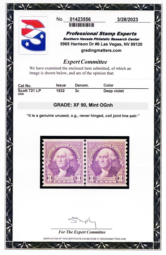 721, Mint XF NH 3¢ Coil Line Pair With Graded 90 PSE Certificate Stuart Katz