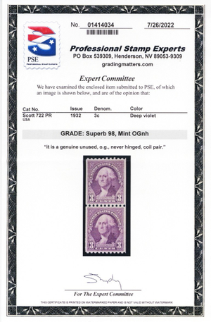 722, Mint Superb NH 3¢ Coil Pair - Graded 98 PSE Certificate * Stuart Katz