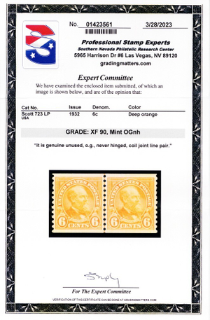 723, Mint XF NH 6¢ Coil Line Pair With Graded 90 PSE Certificate Stuart Katz