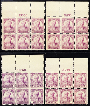725, Mint F-VF NH 3¢ FOUR Plate Blocks CV $80.00 - Stuart Katz