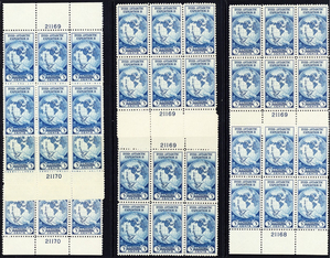 733, Mint VF NH 3¢ SEVEN Plate Blocks CV $105.00 - Stuart Katz