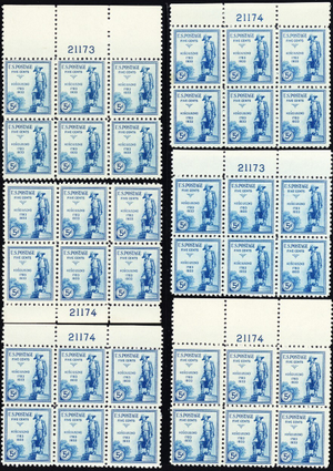 734, Mint FVF NH 5¢ SIX Plate Blocks CV $168.00 - Stuart Katz