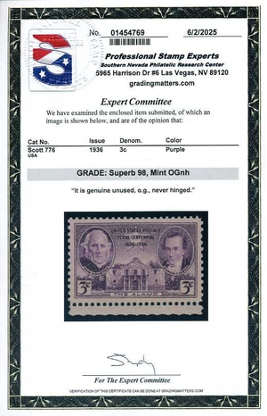 776, Texas Centennial, Mint NH, PSE Graded Superb 98 Certificate, SMQ$85