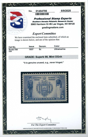 794, 5¢ Naval Academy, Mint NH, PSE Graded Superb 98 Certificate, SMQ $75
