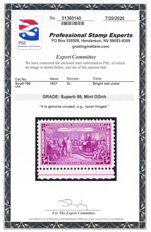 798, Mint NH Superb 3¢ - PSE Graded 98 Certificate - Stuart Katz