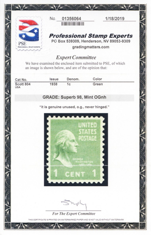 804, Mint NH 1¢ Superb - With Graded 98 PSE Certificate - Stuart Katz
