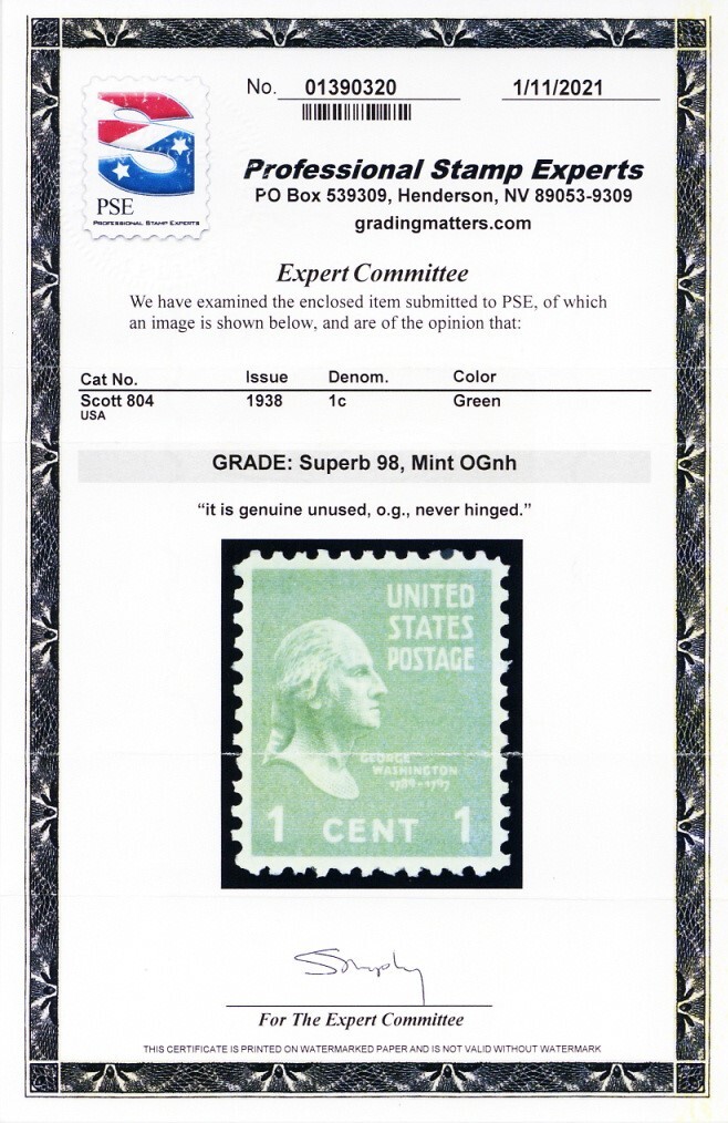 804, Mint Superb NH 1¢ With PSE Graded 98 Certificate * Stuart Katz