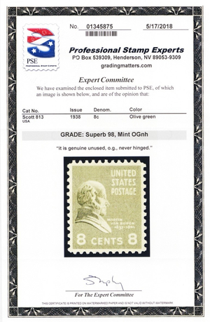 813, Mint Superb NH 8¢ With PSE Graded 98 Certificate * Stuart Katz