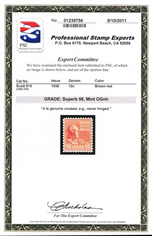 815, Mint NH 10¢ Superb - With Graded 98 PSE Certificate - Stuart Katz