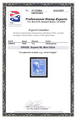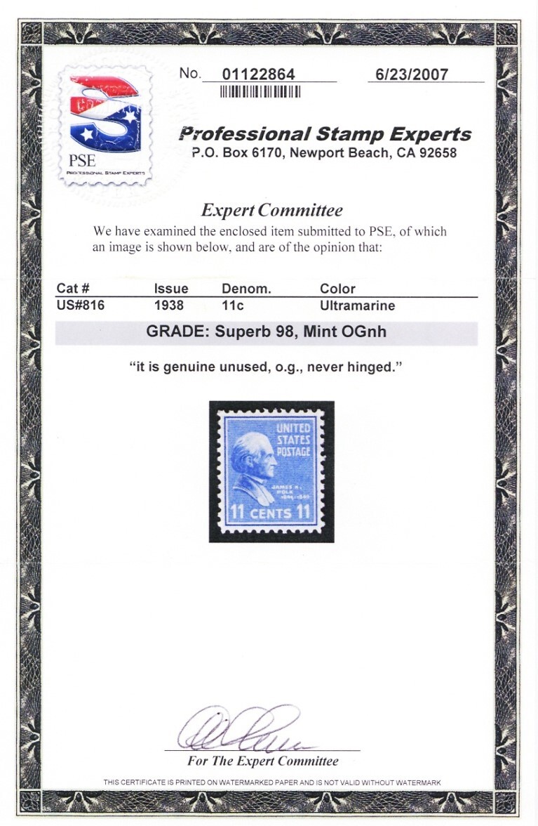 816, Mint NH 11¢ Superb - With Graded 98 PSE Certificate - Stuart Katz