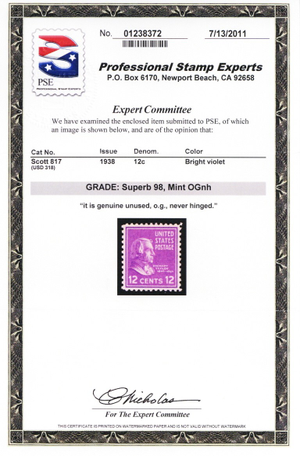 Due to the high cost of obtaining certificates we will only refund the cost of the stamp and not the cost of the certificate for stamps that sell for less than $250 that come back with a negative certificate. Stamps that sell for above $250 will receive a full refund for both the price of the stamp and cost of the certificate if it should come back not as described. For U.S. stamps only certificates from either APS, PSE or from the Philatelic Foundation are accepted, however "graded" certificates or "encased" items are not accepted.