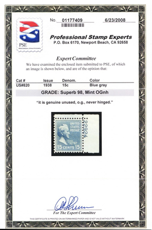 820, Mint NH 15¢ Superb - With Graded 98 PSE Certificate - Stuart Katz