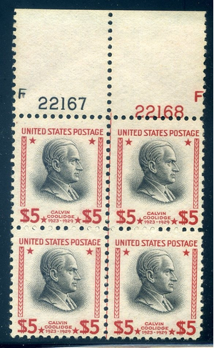 834, $5 Prexy Plate Block, Mint NH, Scott $325
