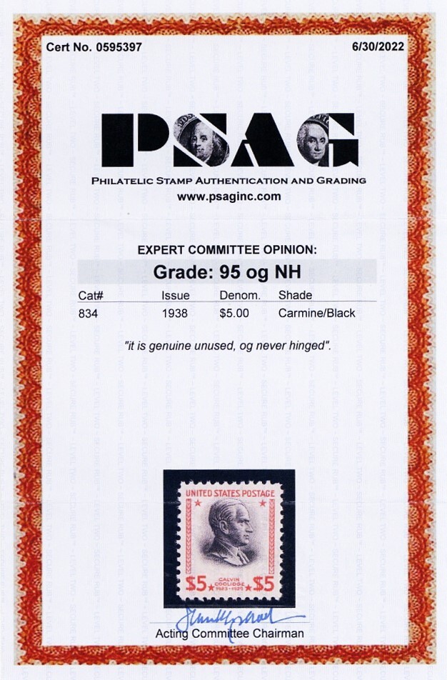 834, Mint XF/Superb NH $5 With PSAG Graded 95 Certificate * Stuart Katz