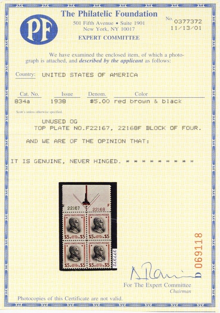 834a, MNH XF Red Brown And Black Plate Block - With PFC Certificate Stuart Katz