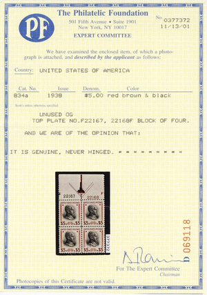 Due to the high cost of obtaining certificates we will only refund the cost of the stamp and not the cost of the certificate for stamps that sell for less than $250 that come back with a negative certificate. Stamps that sell for above $250 will receive a full refund for both the price of the stamp and cost of the certificate if it should come back not as described. For U.S. stamps only certificates from either APS, PSE or from the Philatelic Foundation are accepted, however "graded" certificates or "encased" items are not accepted.