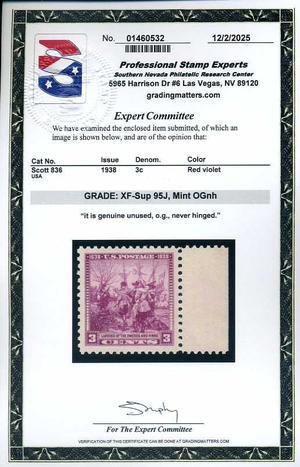 836, 3¢ Landing of Swedes, PSE Graded XF-Sup 95J Mint NH Cert, SMQ $50