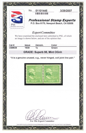 839, Mint NH Superb 1¢ Coil Line Pair - PSE Graded 98 Certificate - Stuart Katz