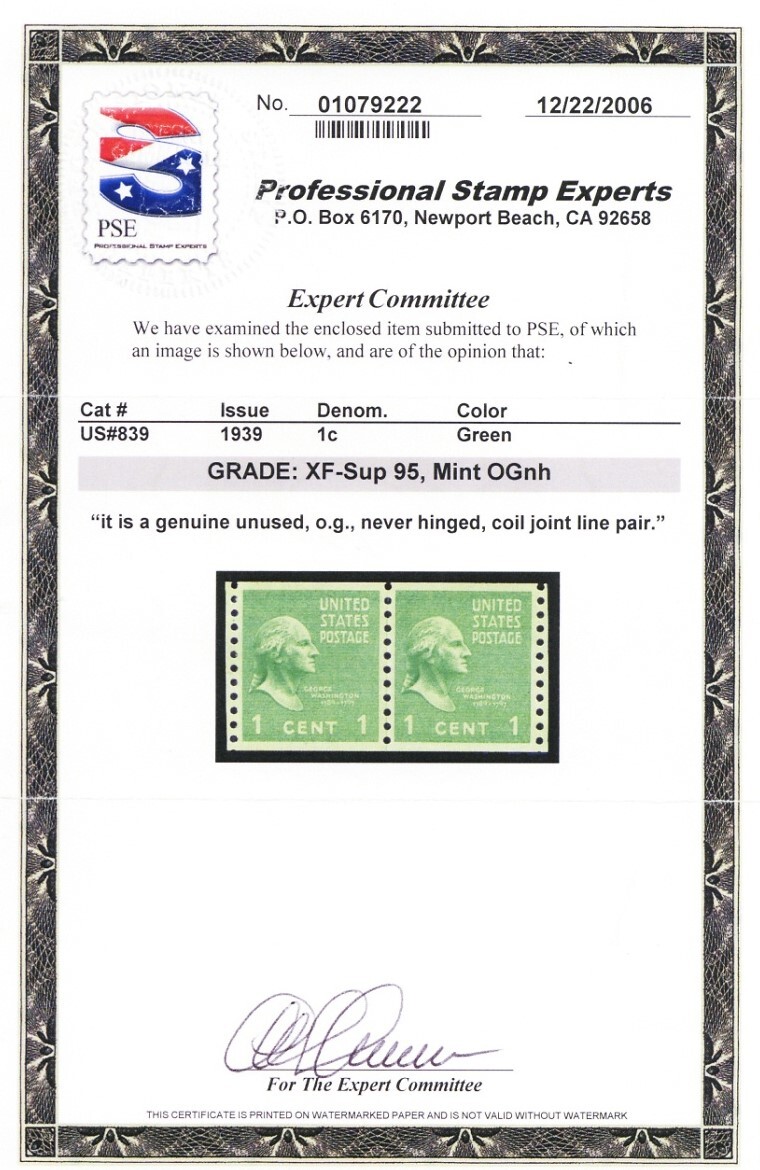 839, MNH XF/Superb Coil Line Pair - PSE Graded 95 Certificate - Stuart Katz