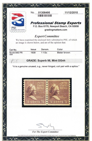 840, MNH Superb Coil Tape Splice Pair - PSE Graded 98 Certificate - Stuart Katz