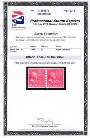 841, Mint XF/Superb NH 2¢ Line Pair With PSE Graded 95 Certificate * Stuart Katz