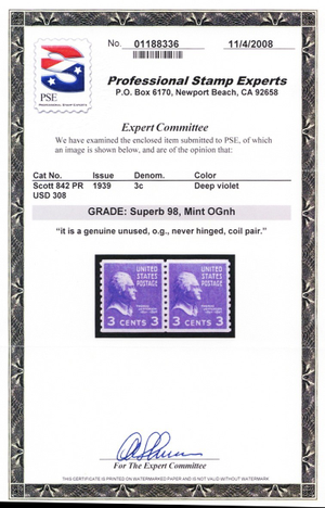 842, Mint Superb NH 3¢ Coil Pair With Graded 98 PSE Certificate - Stuart Katz