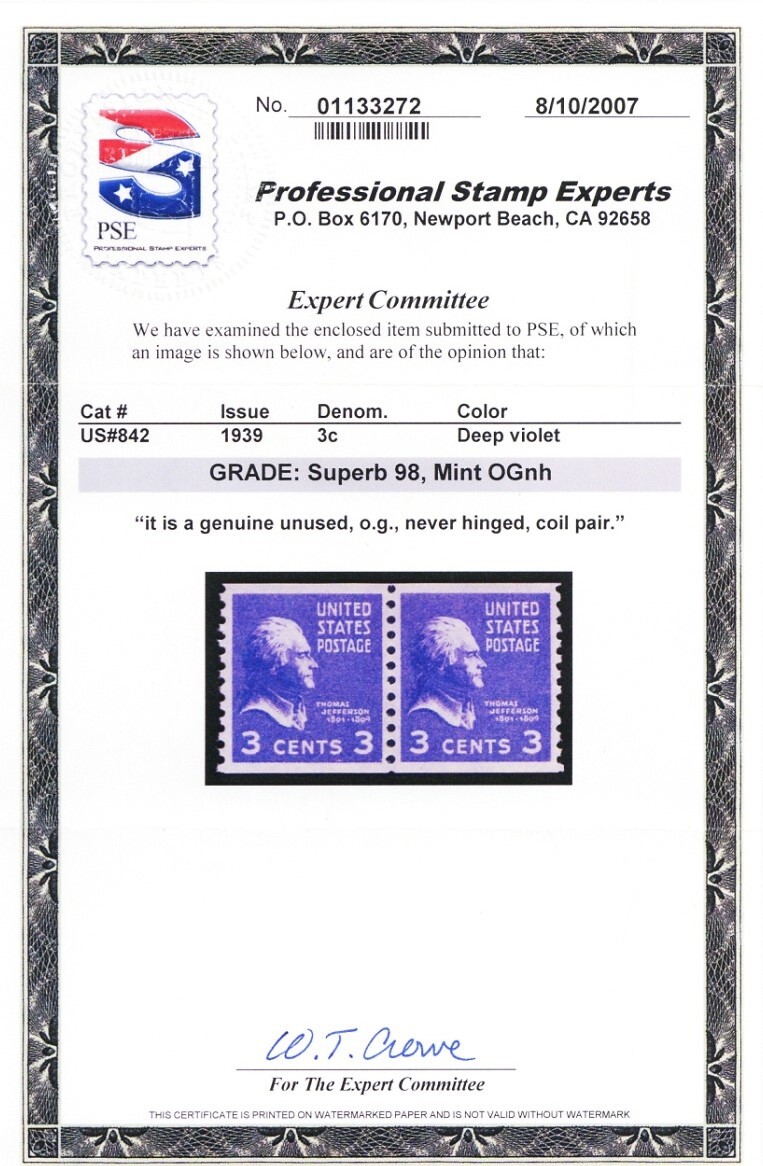 842, MNH XF/Superb 3¢ Coil Line Pair - PSE Graded 95 Certificate * Stuart Katz