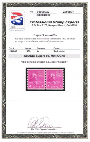 No refunds will be made after 60 days after the sale date unless extra time is granted. Due to the high cost of obtaining certificates we will only refund the cost of the stamp and not the cost of the certificate. For U.S. stamps only certificates from either APS, PSE or from the Philatelic Foundation are accepted, however "graded" certificates or "encased" items are not accepted.