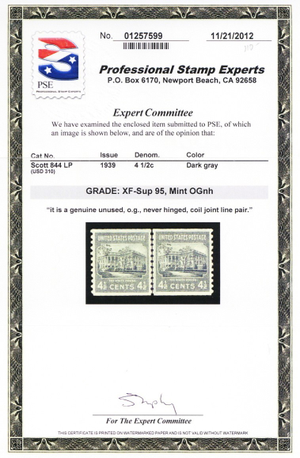 844, Mint NH XF/Superb Coil Line Pair - PSE Graded 95 Certificate - Stuart Katz