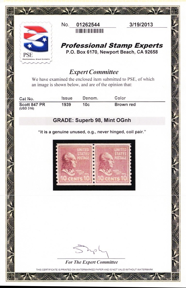 847, MNH Superb 10¢ Coil Pair PSE Graded 98 - Certificate Stuart Katz