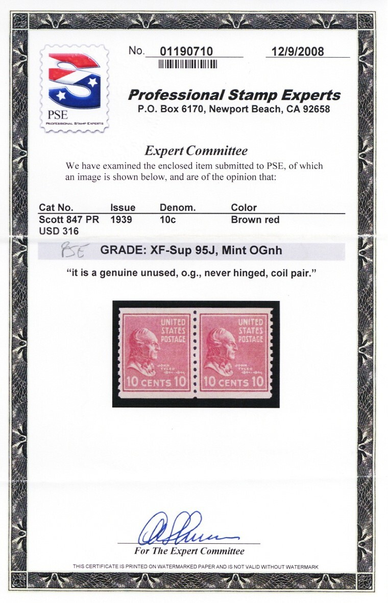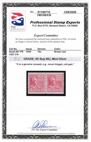 847, MNH XF/Superb Coil Pair - PSE Graded 95J JUMBO Certificate ** Stuart Katz