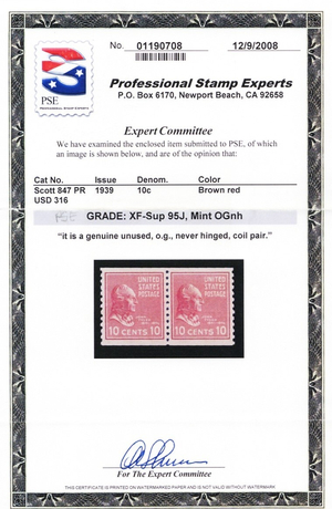847, MNH XF/Superb Coil Pair - PSE Graded 95J JUMBO Certificate - Stuart Katz