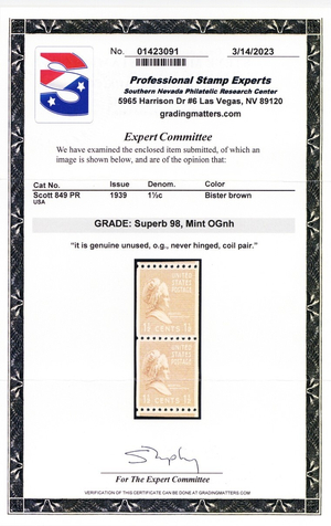 849, Mint Superb NH Coil Pair - With Graded 98 PSE Certificate - Stuart Katz