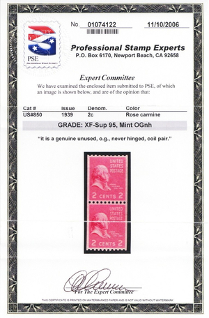 850, MNH XF/Superb 2¢ Coil Line Pair - PSE Graded 95 Certificate * Stuart Katz