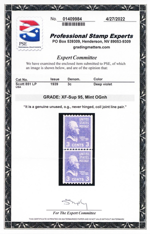 851, MNH XF/Superb 3¢ Coil Line Pair - PSE Graded 95 Certificate ** Stuart Katz