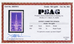 852, Mint NH Superb 3¢ - PSAG Graded 100 Certificate - Stuart Katz