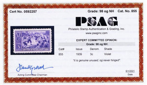 Due to the high cost of obtaining certificates we will only refund the cost of the stamp and not the cost of the certificate for stamps that sell for less than $250 that come back with a negative certificate. Stamps that sell for above $250 will receive a full refund for both the price of the stamp and cost of the certificate if it should come back not as described. For U.S. stamps only certificates from either APS, PSE or from the Philatelic Foundation are accepted, however "graded" certificates or "encased" items are not accepted.