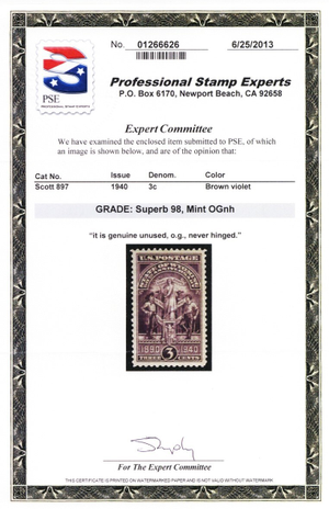 Due to the high cost of obtaining certificates we will only refund the cost of the stamp and not the cost of the certificate for stamps that sell for less than $250 that come back with a negative certificate. Stamps that sell for above $250 will receive a full refund for both the price of the stamp and cost of the certificate if it should come back not as described. For U.S. stamps only certificates from either APS, PSE or from the Philatelic Foundation are accepted, however "graded" certificates or "encased" items are not accepted.