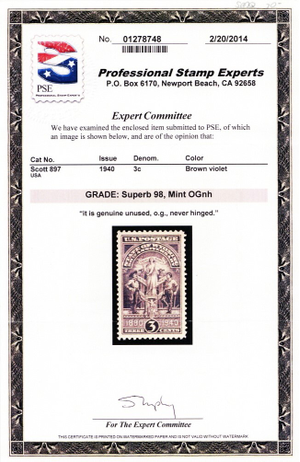 Due to the high cost of obtaining certificates we will only refund the cost of the stamp and not the cost of the certificate for stamps that sell for less than $250 that come back with a negative certificate. Stamps that sell for above $250 will receive a full refund for both the price of the stamp and cost of the certificate if it should come back not as described. For U.S. stamps only certificates from either APS, PSE or from the Philatelic Foundation are accepted, however "graded" certificates or "encased" items are not accepted.