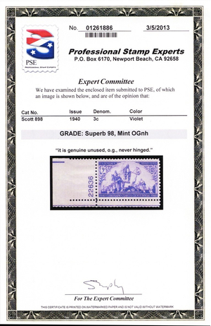 Due to the high cost of obtaining certificates we will only refund the cost of the stamp and not the cost of the certificate for stamps that sell for less than $250 that come back with a negative certificate. Stamps that sell for above $250 will receive a full refund for both the price of the stamp and cost of the certificate if it should come back not as described. For U.S. stamps only certificates from either APS, PSE or from the Philatelic Foundation are accepted, however "graded" certificates or "encased" items are not accepted.