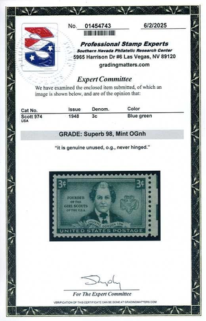 974, Juliette Low, Mint NH, PSE Graded Superb 98 Certificate, SMQ $95