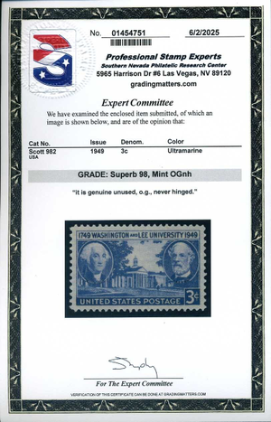 982, Washington & Lee University, MNH, PSE Graded Superb 98 Certificate, SMQ $55