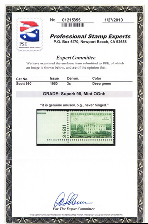 No refunds will be made after 60 days after the sale date unless extra time is granted. Due to the high cost of obtaining certificates we will only refund the cost of the stamp and not the cost of the certificate. For U.S. stamps only certificates from either APS, PSE or from the Philatelic Foundation are accepted, however "graded" certificates or "encased" items are not accepted.